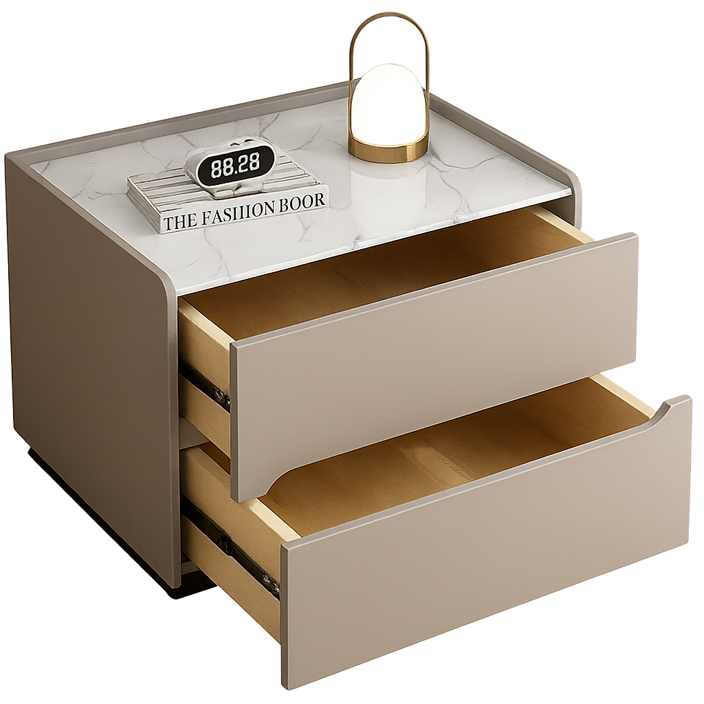 Dotée de deux tiroirs spacieux, elle offre un rangement pratique pour vos effets personnels tout en conservant une allure sobre et raffinée. Son plateau supérieur en effet marbre ajoute une note élégante et permet d’accueillir lampe, réveil ou objets décoratifs.